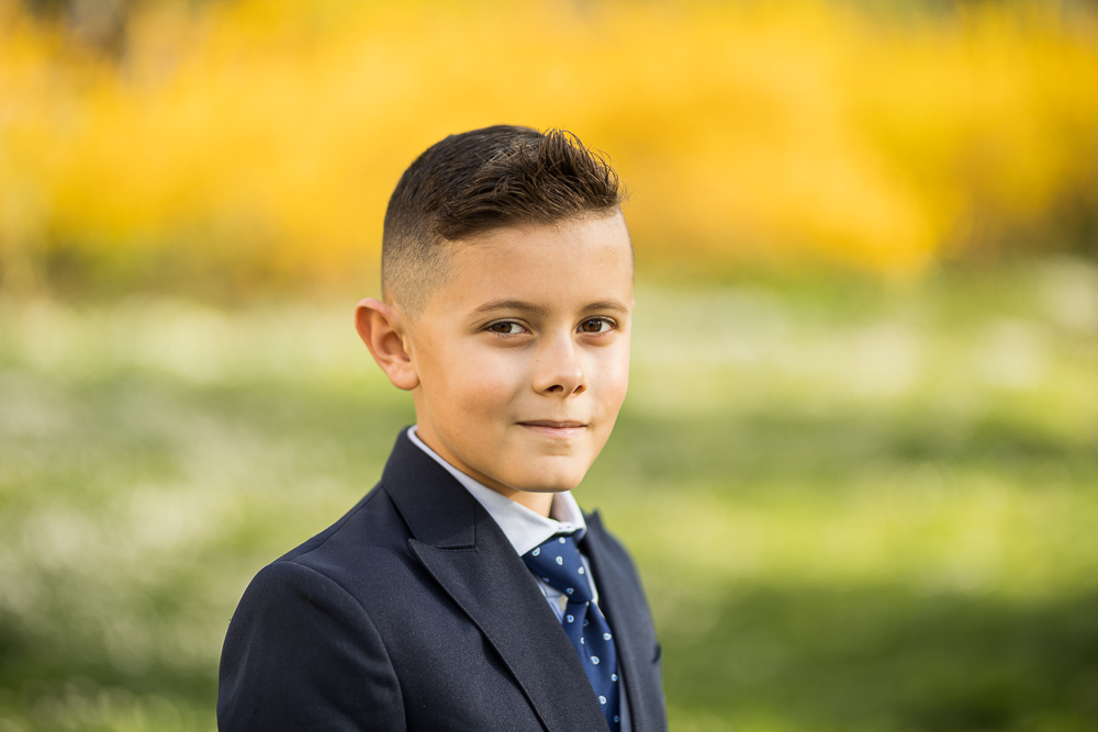 Sesion de fotos preComunion de un niño con chaqueta y corbata azul en El Retiro, le veremos saltando, chutando un balon y posando como un modelo también